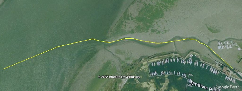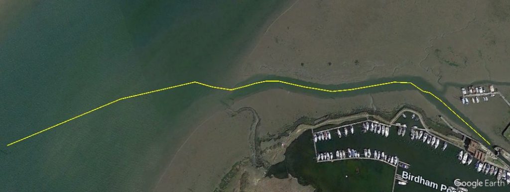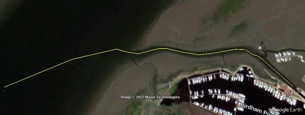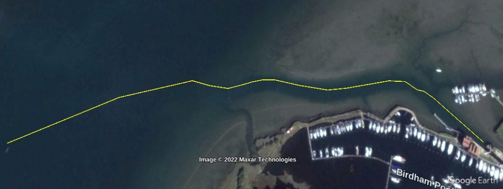 These images shows the line of the current deeper water in yellow overlaid on images from previous years. So you can see how the deeper water has changed over the last 20 years. It does appear to be getting straighter apart from near the channel marker post nearest to the lock.